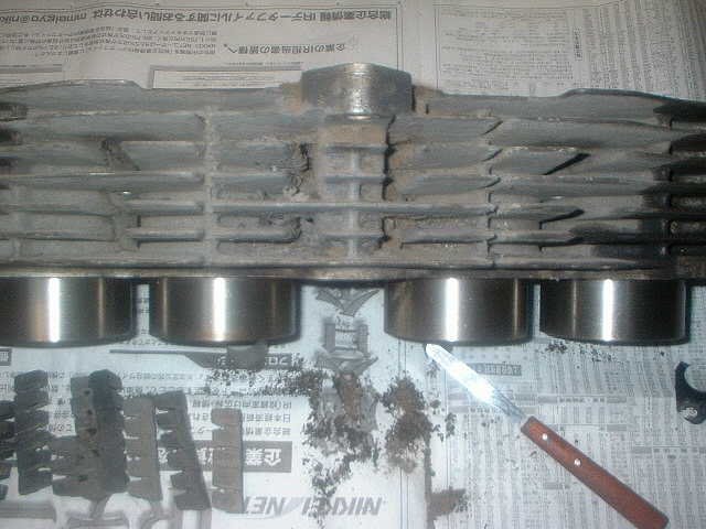 洗浄する前に事前作業で、各気筒の間の隙間に詰まっている物を取り除きます。本来はシリンダー間の隙間を、空気が流れて通リ過ぎる事によりシリンダー冷却を行います。それが空冷です。隙間が詰まってしまうと、空気が流れず充分な冷却は出来ません。