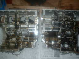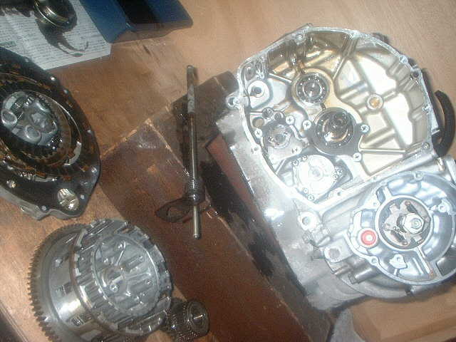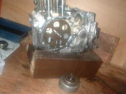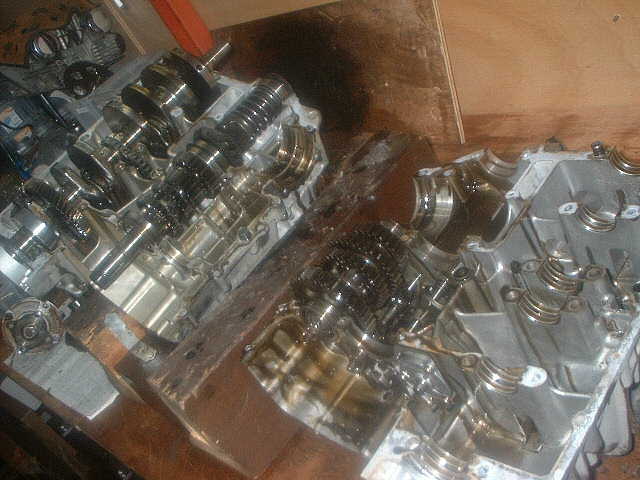 クランクシャフト部分は12mm ギア部分は10mmのヘッドボルトがそれぞれ上下から締付けられています。クランクケース上側にクランクシャフト&ギアを残す様にして(エンジンをひっくり反します)クランクケース下側を持ち上げます。
