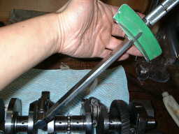 クランクシャフトに、コンロッドを取付けます。今回のコンロッドジャーナルメタルベアリングは、1番〜4番なで、全て同じメタルカラー(グリーン)でした。