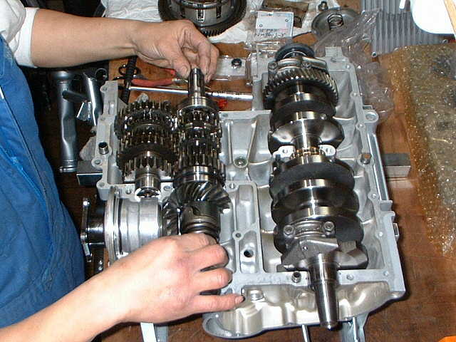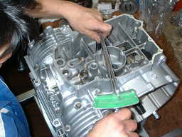 クランクケースのロアケース側に、液体ガスケットを塗布して、アッパーケースに被せて取付けます。 ミッションのシフトフォークの合わせ噛合わせが、一番