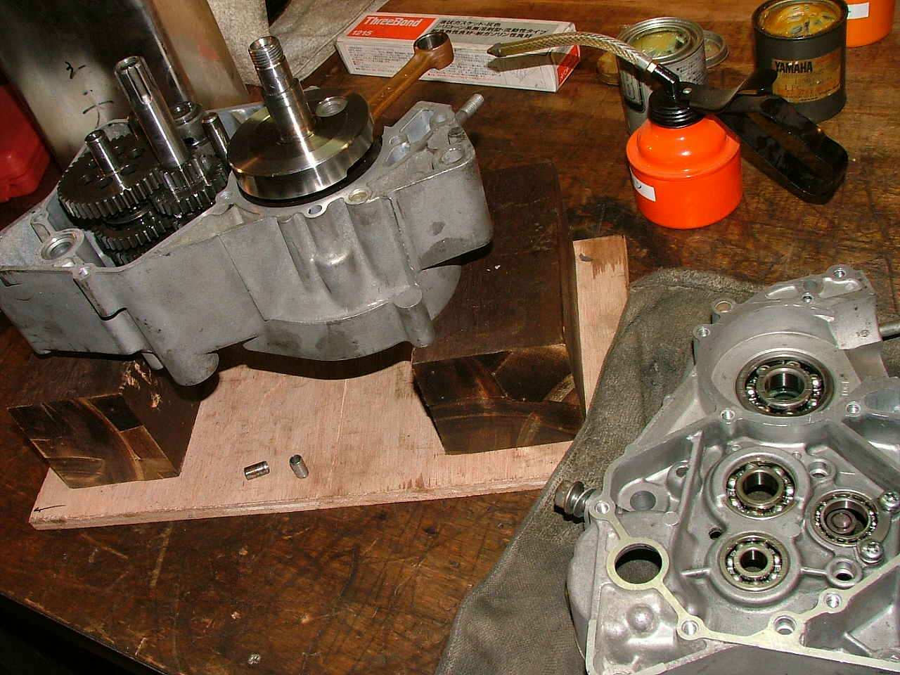 サブエンジンも同時進行です。サブエンジンの組立ては、メインエンジン組立て後に残った部品の中で、最良の部品を使って組上げていきます。 但しベアリングだけは、メインエンジンと同じ用に新品(クランクシャフトベアリングは精密)を使います。