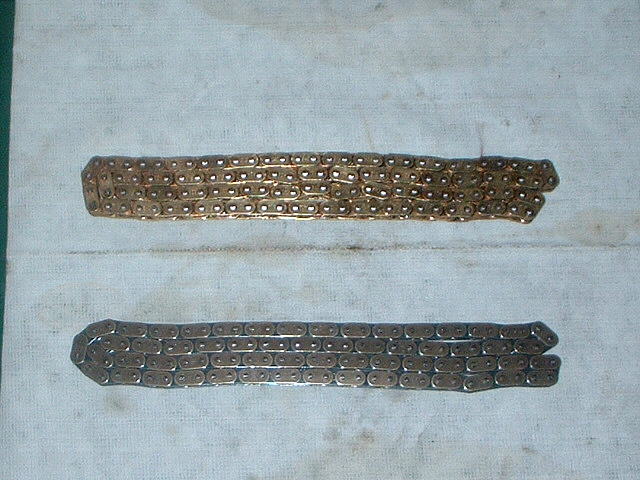 今回使用するレーシングカムチェーン:上(下がノーマルです) スーパーダイハード表面処理をチェーンのピンに施すことで、耐極圧性・耐磨耗性がUPしています。