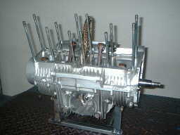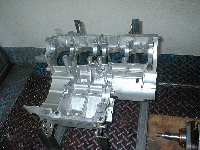 この上に、ロアクランクケースを取り付けます。 合わせ面に液体ガスケットを塗りますが、ベアリングとの合面はしっかり塗ります。合面の中でオイル通路の廻りに、必要以上に塗るのはいけません。注意が必要です。