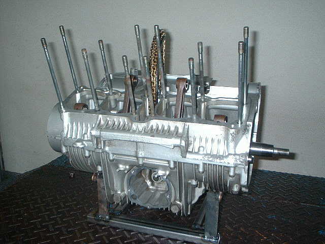 クランクケース合わせボルトの締め付け順序は、クランクケースに浮き出ています。順序にそって、仮締め→本締めで締め付けます。 レーシングカムチェーンの金色が光っています。