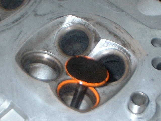 全体的に綺麗に移転していればOKです。浮き沈みが有る場合は、再度擦り合わせを行ないます。 光明丹を使わない方法もあります。バルブスプリングを完全に組付けて、通常使用状態にした所にポート側からガソリンor灯油を流し込みます。滲んでこなければOKです。