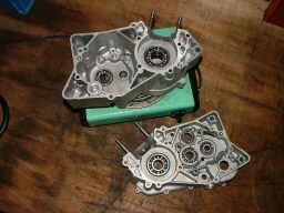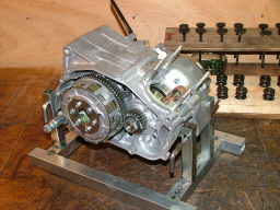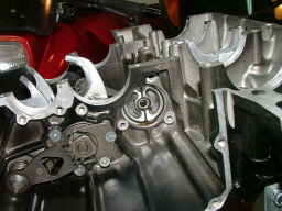 エンジンの腰下=クランクケース側を、先にフレームに載せます。 |