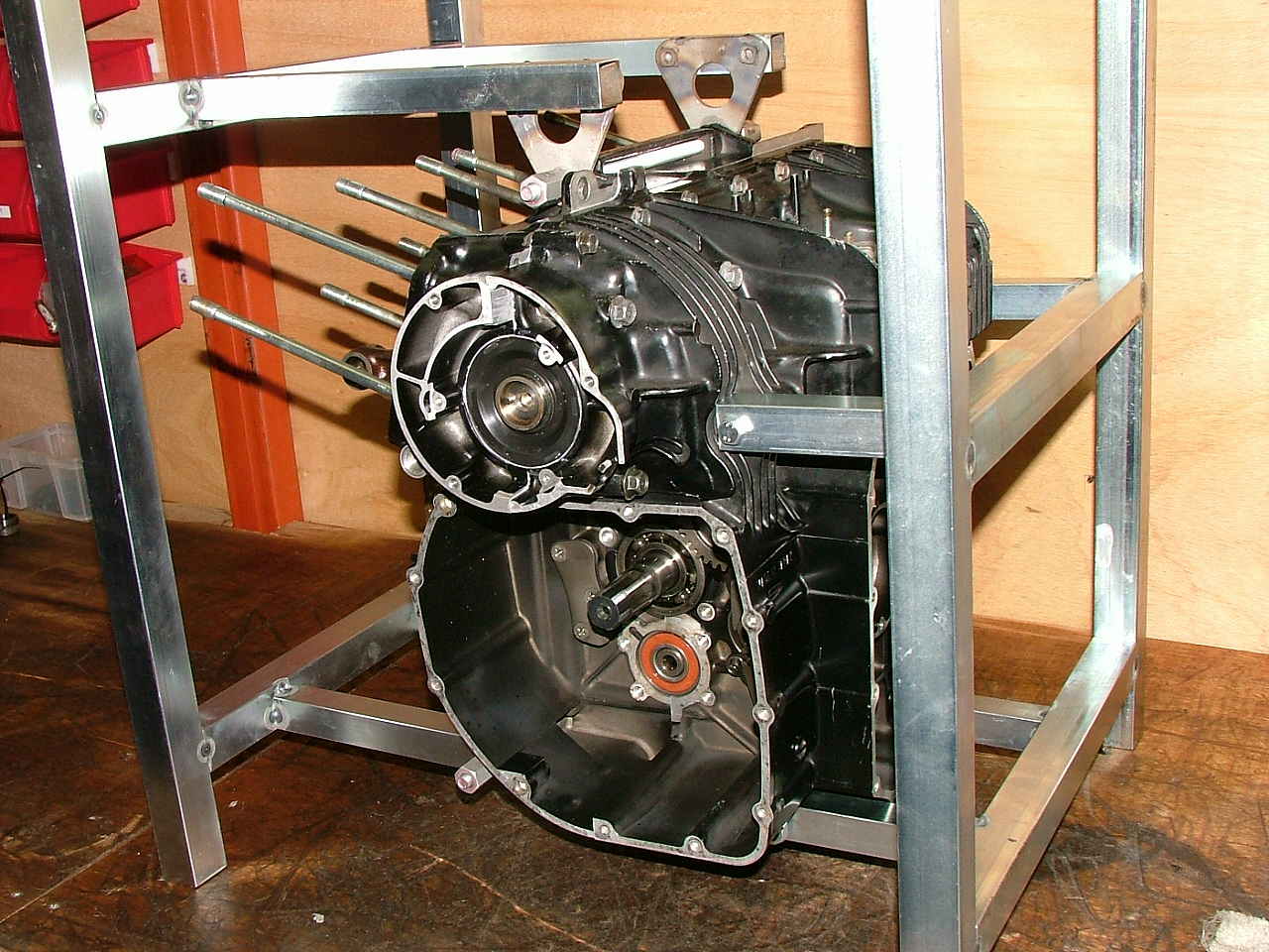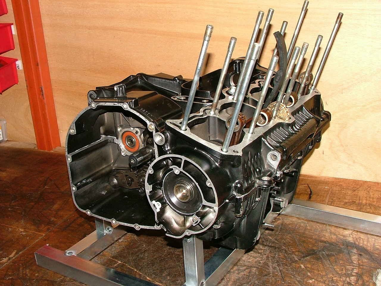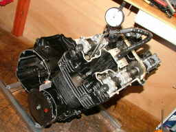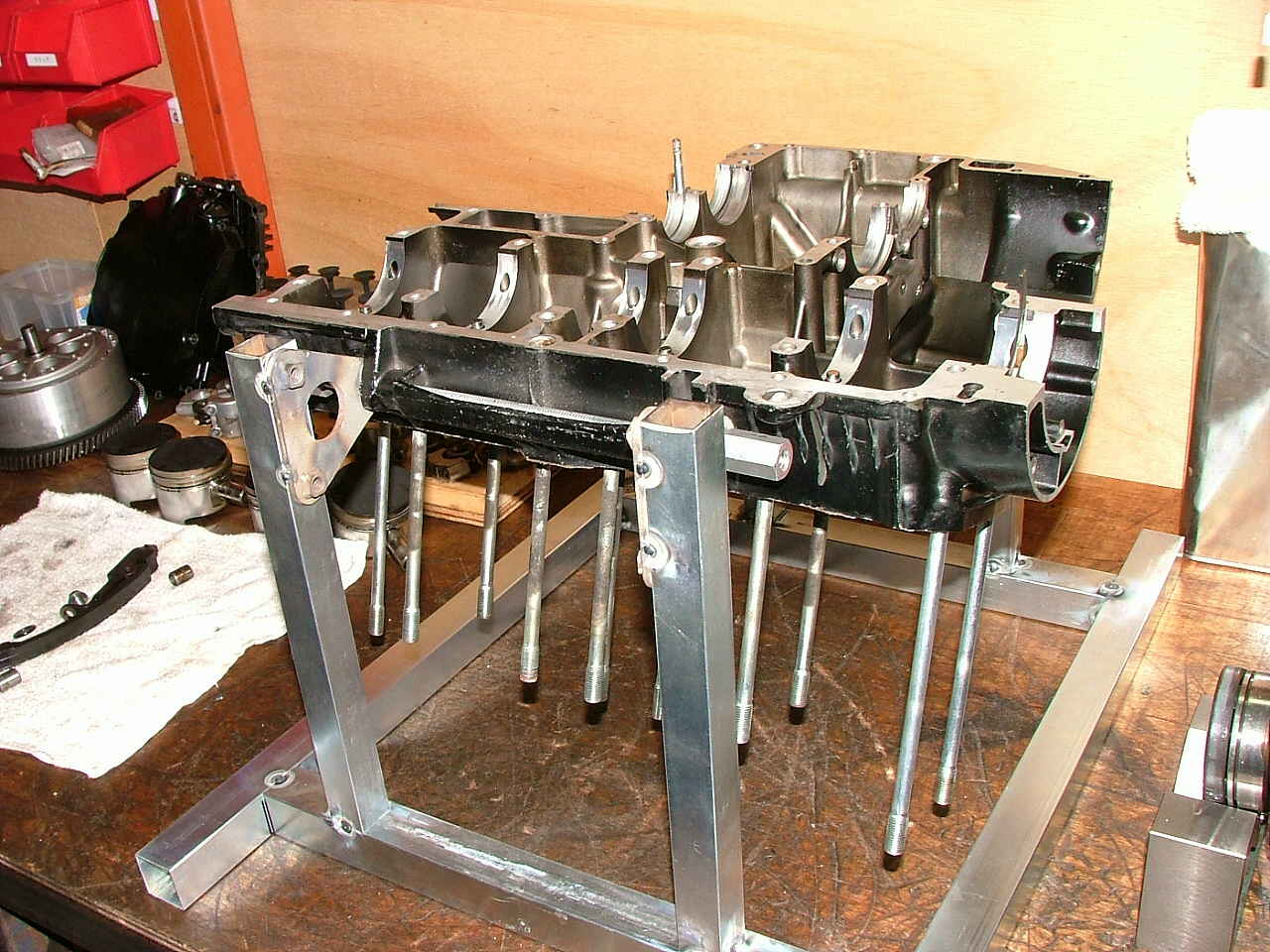 クランクケースが上下分割の場合、上部クランクケースを逆向きにしてクランクシャフト、ミッション等を組込みます。