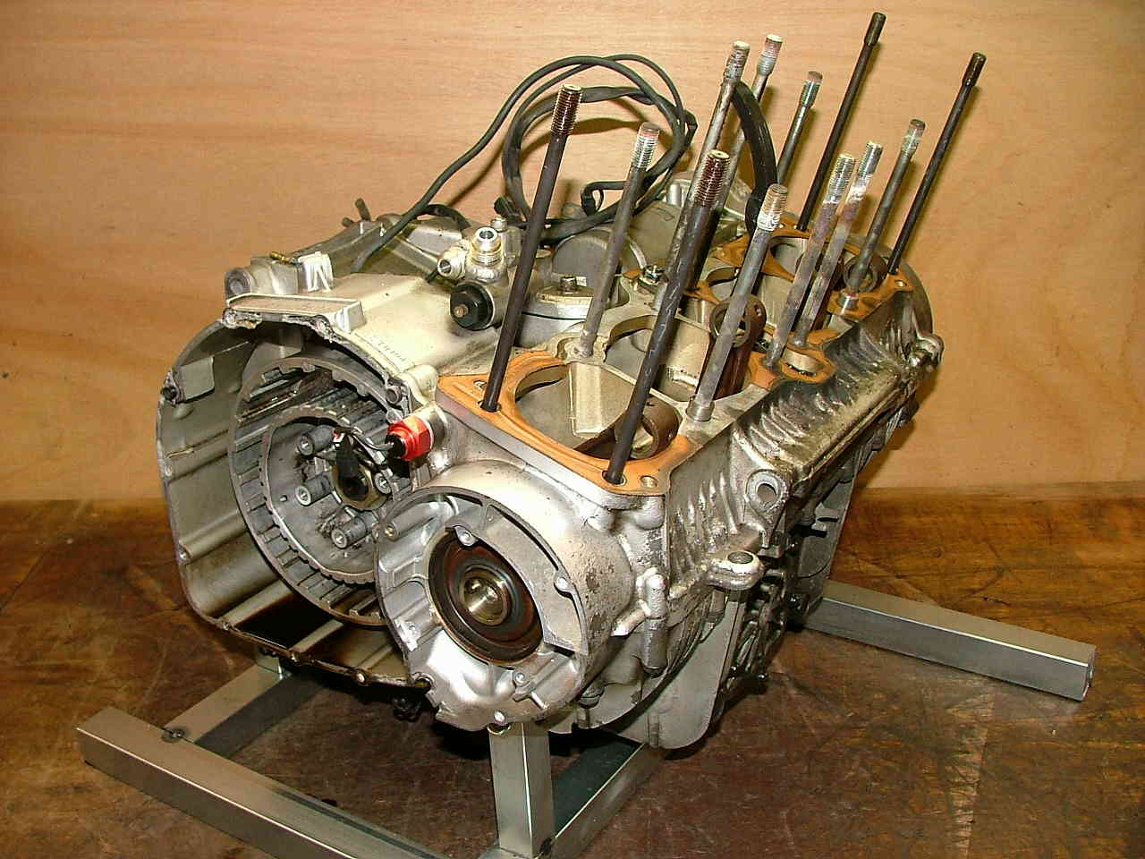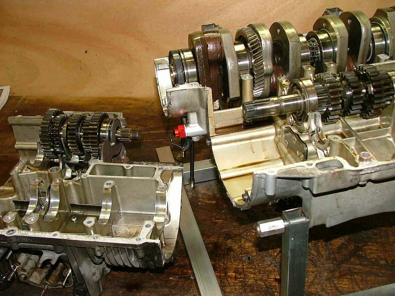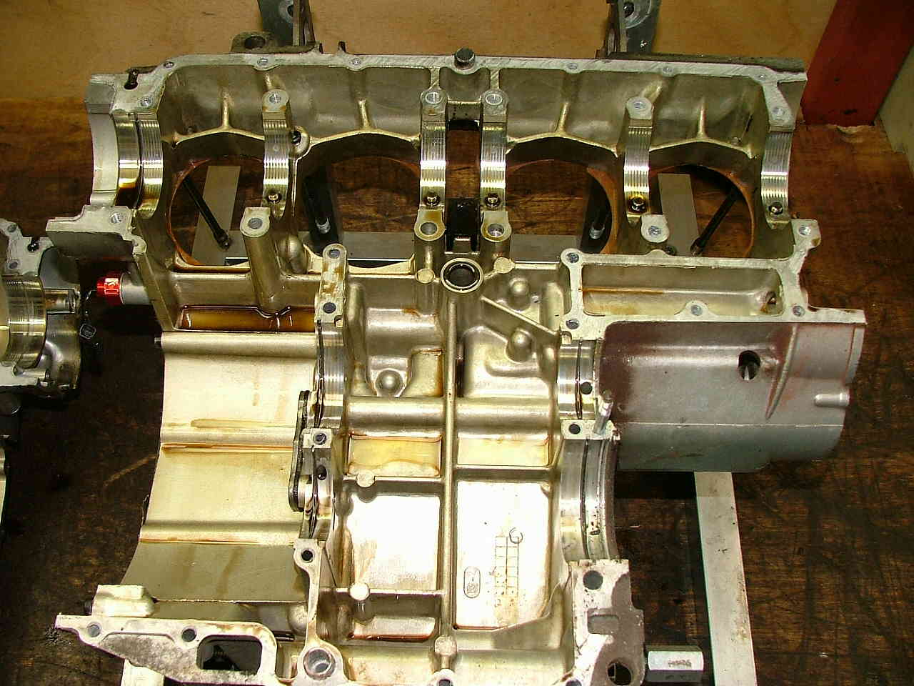 クランクケースは上下分解での組合せになっています。 クランクケース上部を下側(クランクケースをひっくり返します)にして、下側クランクケースを外します。 |