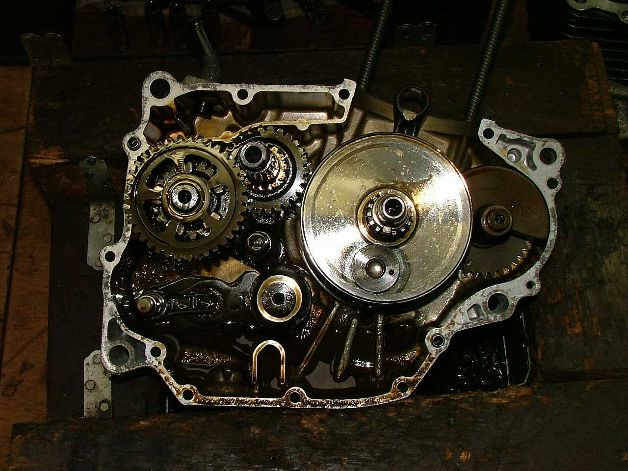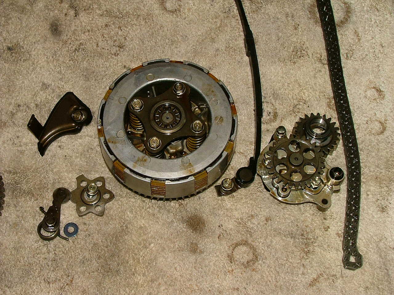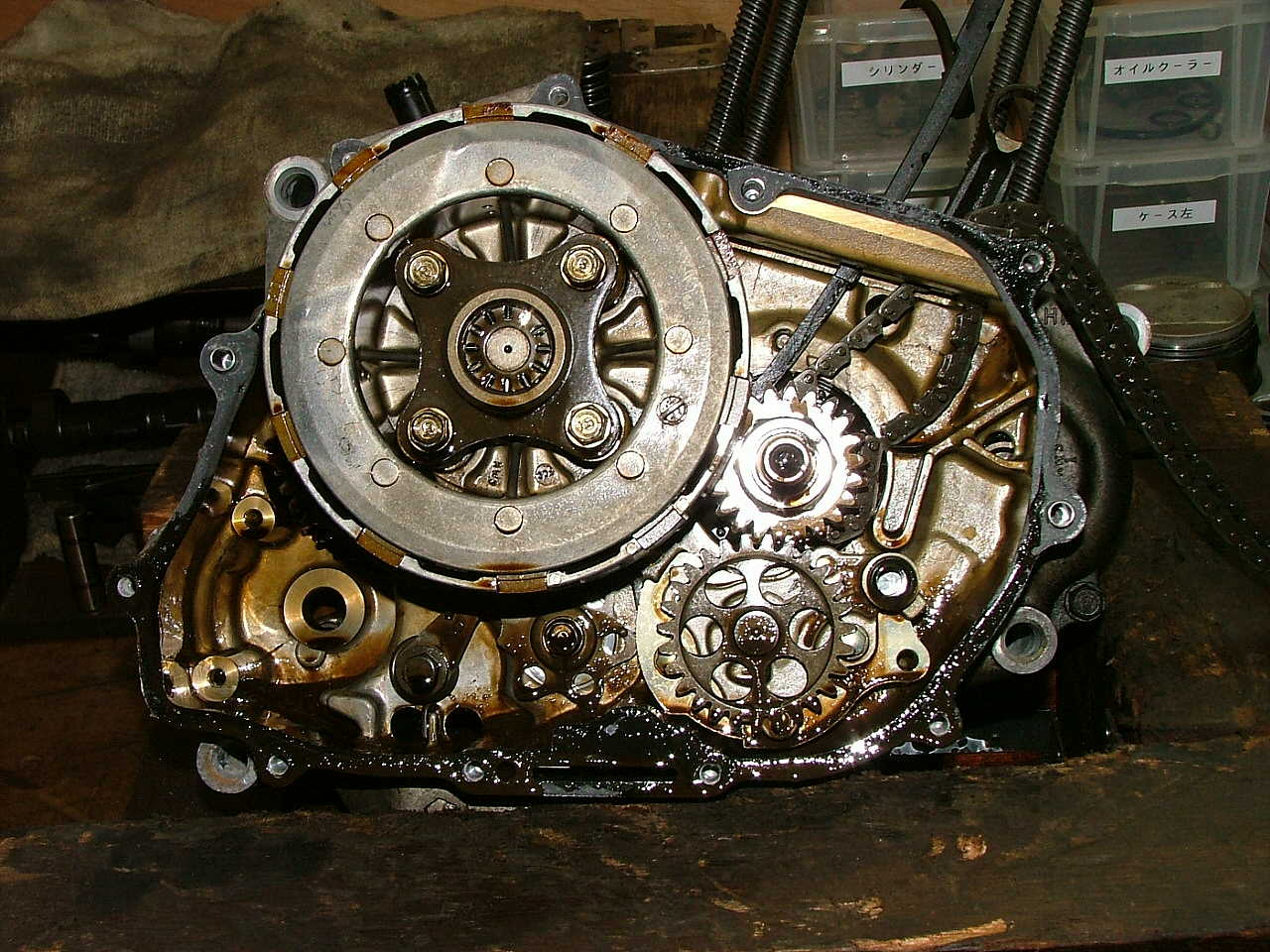 カムチェーン、オイルポンプ、カムチェーンテンショナガイド、クラッチハウジング、ミッション系の部品です。