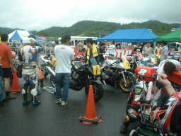 レース当日です。朝から小雨が降ったり止んだり。週間予報では‘曇り後晴れ’だったのに・・・ 朝一番の予選クラス(ハーレー883系)の時はコースは乾いていたのですが、次のクラスあたりから、再度パラパラ・・・