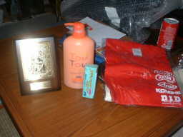 1位の盾&景品もろもろです、シャンプーはいいですねぇ〜カタナに最高のカーボンの○○○も有りました(嬉) Tシャツ関係はSサイズがほとんどでしたが(笑)